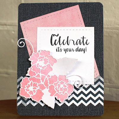 Inspired by the versatile FUSION sketch and fabulous graphic colours and patterns in the FUSION inspiration photo, this week I had a play with my Gelatos to watercolour the pink layer used to fussy cut behind the carnations diecut, pop-dotted for added dimension over the two Lil Inkers stitched square and rectangles, and fussy cut MME paper chevron border. I just love this gorgeous WPlus9 birthday sentiment, and denim look MME patterned paper.