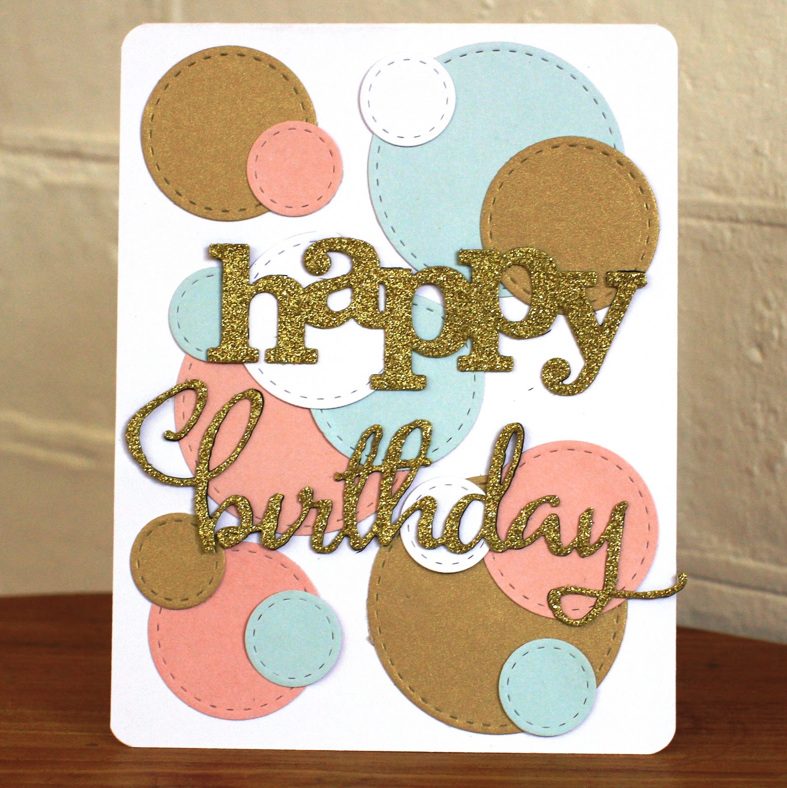Super fun playing along with this fortnights FUSION! Created circles of various sizes in gold teal pink and white using Lil Inkers Stitched Circle dies, and overlaid with these gorgeous Winnie and Walter sentiments in gold glitter paper, backed with black cardstock.